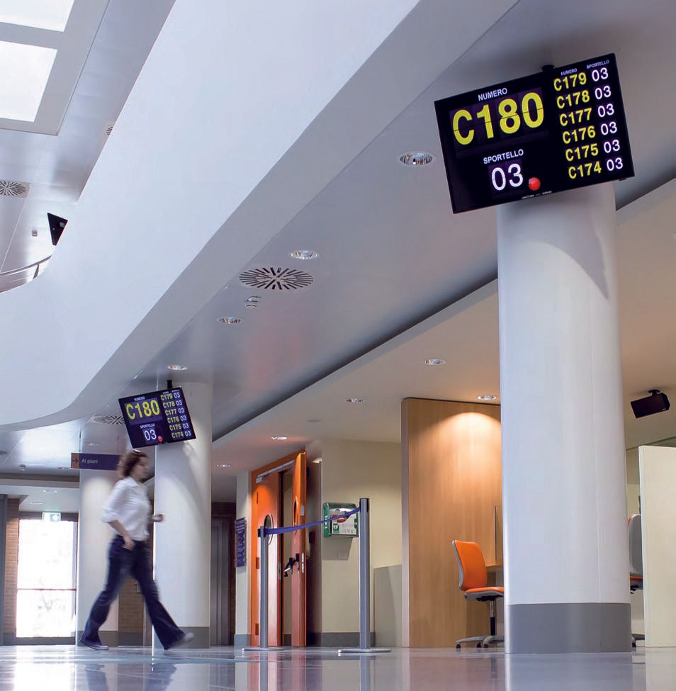 - Il display riepilogativo di sala LCD-TFT riporta l’elenco degli ultimi numeri chiamati per i vari servizi e i corrispondenti sportelli. Il layout riproduce gli storici display a palette Solari. Opzionalmente è possibile utilizzare un suono associato alla chiamata o una chiamata vocale. È possibile realizzare varie configurazioni del layout video, in orizzontale o in verticale, con o senza la dicitura relativa al servizio associato